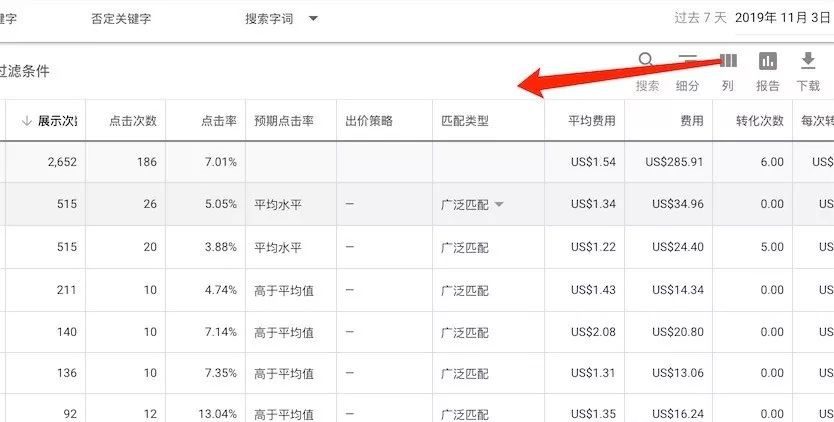 1,在广告后台关键词部分,我们点击右上方的列,然后选择修改列